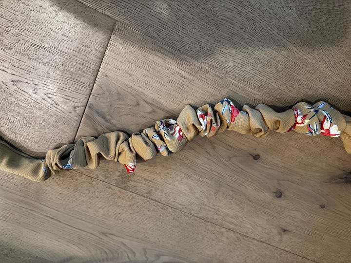 I sense that lightweight, gauzy fabrics work best for this to get the optimal scrunch (Fabricland had a great selection…I used a rather retro 80’s floral for this project and picked up a silky ticking stripe for future use.) Also note, you’ll need to sew covers that are at least 2.5x the cord length, again, for optimal scrunch.
